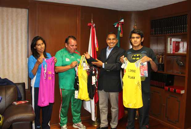 En breve acto, celebrado en su despacho, el Rector convivió con el equipo de seleccionados tlaxcaltecas que participarán en las pruebas de natación, esgrima, equitación y la combinada de tiro y carrera pentatlón, bajo la conducción del entrenador Miguel Teyssier Montes.