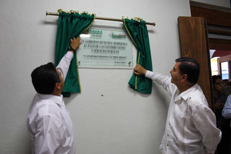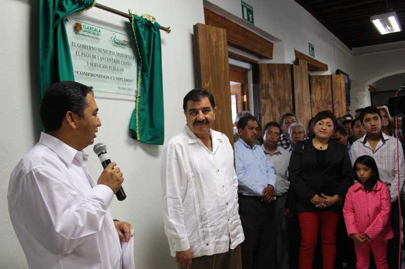 Chiautempan, Tlax .- Buscando mejorar las finanzas de la administración pública municipal, a través de la modernización del sistema de recaudación de ingresos propios y pago de los diversos servicios, el gobernador del Estado, Mariano González Zarúr y el alcalde Ángel Meneses Barbosa inauguraron las oficinas administrativas del área de ingresos para agilizar los trámites relacionados con el pago del impuesto predial.