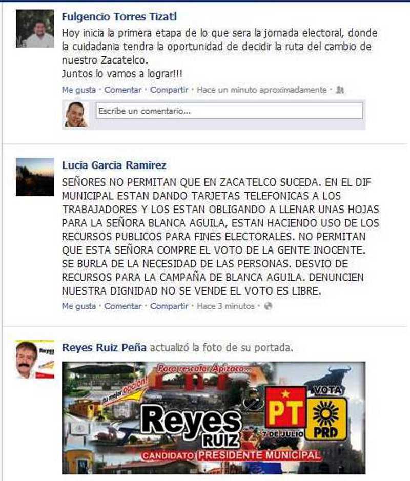 En su muro, advirtió de la aparente irregularidad; “señores no permitan que en Zacatelco suceda…en el DIF municipal están dando tarjetas telefónicas a los trabajadores y los están obligando a llenar unas hojas para la señora Blanca Águila, están haciendo uso de los recursos públicos para fines electorales”.