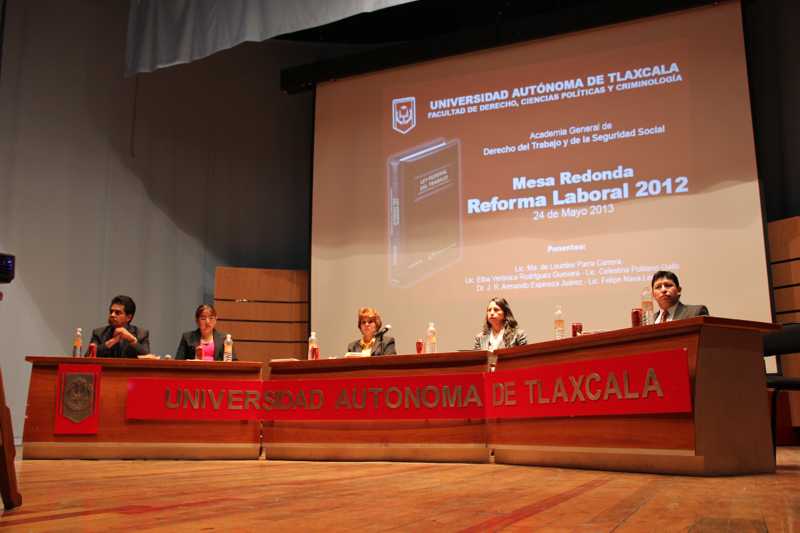 Con el objetivo de promover y difundir los aspectos fundamentales de la reforma laboral aprobada por el Congreso de la Unión en noviembre del año pasado y acrecentar el conocimiento jurídico-teórico-práctico del Derecho del Trabajo, la Academia General de Derecho del Trabajo y de la Seguridad Social de la Facultad de Derecho, Ciencias Políticas y Criminología de la Universidad Autónoma de Tlaxcala (UAT) realizó la mesa redonda “Reforma laboral 2012”.