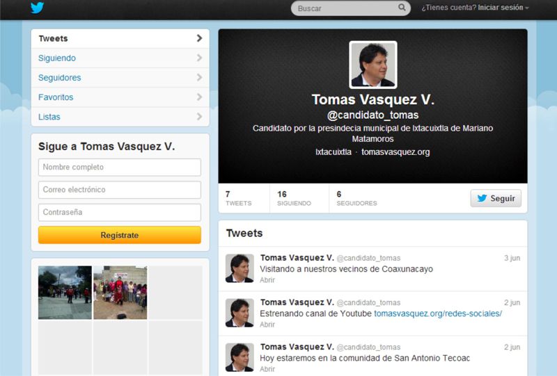 Del mismo modo, la cuenta en facebook de Tomás Vásquez está abierta para quien desee dejar comentarios o tener contacto con el candidato, quien difunde ahí los encuentros que ha tenido con la ciudadanía, a través de una serie de fotografías y videos.