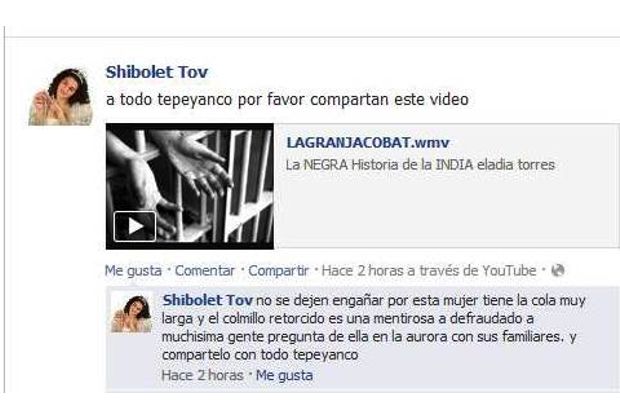 Es de resaltar que en la red social pública Facebook, Shibolet Tov conminó a los cibernautas a que; “no se dejen engañar por esta mujer tiene la cola muy larga y el colmillo retorcido es una mentirosa ha defraudado a muchísima gente pregunta de ella en La Aurora con sus familiares y compártelo con todo Tepeyanco”.