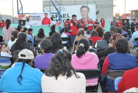 En diversas reuniones organizadas por vecinos de la zona, Rafael Ortega escuchó sus peticiones y se comprometió a trabajar eficaz y honestamente desde el ayuntamiento, además de llevar programas de pavimentación, alumbrado público, drenaje y seguridad.