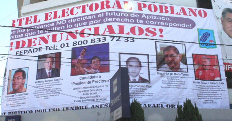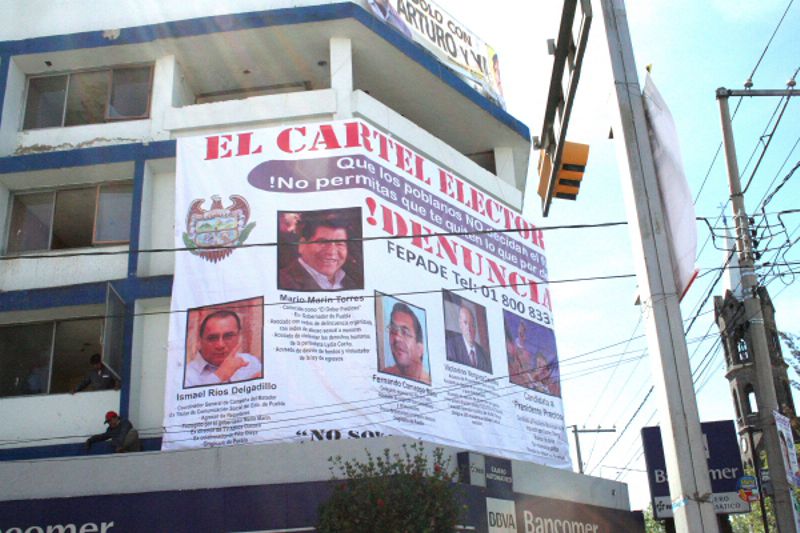 En la manta se lee que se trata de “El Cartel Electoral Poblano, que los poblanos no decidan el futuro de Apizaco”.