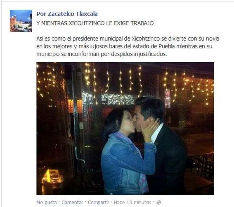 Balconean en red social pública Facebook al presidente municipal de Xicohtzinco Luis Alberto García Badillo de disfrutar de lujosos bares y centros de esparcimiento en la ciudad de Puebla, en lugar de atender los problemas que se suscitan en su municipio, el edil opta por guardar silencio.