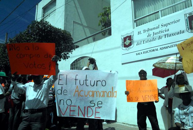 Alrededor de un centenar de ciudadanos del municipio de Acuamanala, se manifestaron este lunes frente a la Sala Unitaria Electoral del Poder Judicial de Tlaxcala, en demanda de que el magistrado Pedro Molina Flores se apegue a derecho y haga valer 20 votos nulos que le fueron marcados ilegalmente al candidato del Movimiento Ciudadano a esa alcaldía, Javier Cuatepitzi Corte.