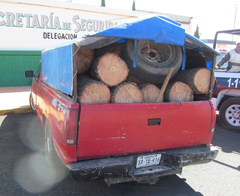 Al descender de su patrulla, observaron que se encontraba una camioneta estacionada en el mismo paraje, marca Chevrolet, tipo Pick up, con placas de circulación XA18416 del estado de Tlaxcala, misma que se encontraba cargada con 48 rollos de madera de aproximadamente 42cm de largo por 38 de grosor.