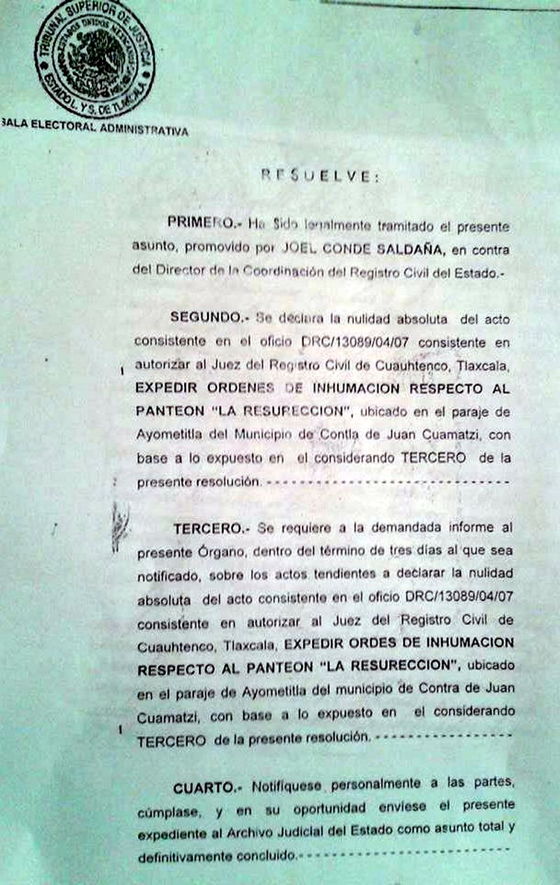 Asimismo, la Sala Unitaria Electoral Administrativa resolvió a favor de la comunidad de la luz para el caso específico del Panteón la Resurrección de la comunidad de la luz se declara la nulidad absoluta para autorizar al juez del registro civil de la comunidad de Cuahutenco expida ordenes de inhumación en el referido Panteón.