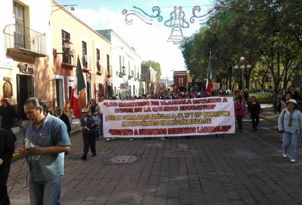 Desde las 9:00 de la mañana, más de un millar de maestros de cuatro organizaciones magisteriales del estado marchan por las calles de la ciudad de Tlaxcala en rechazo a la Reforma Educativa y en particular contra sus leyes secundarias, ya que son lesivas para los derechos de los maestros y ponen en riesgo su estabilidad laboral.