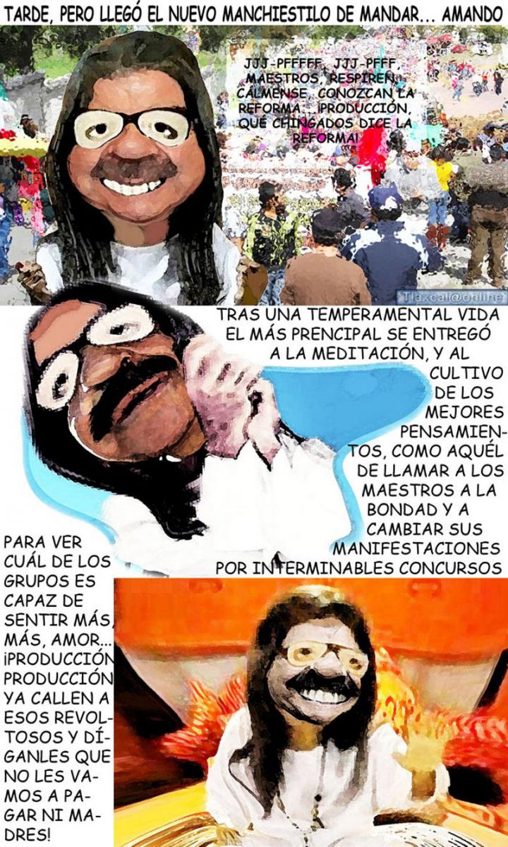 Híjole, parece que la indignación de los maestros ocasionó una metamorfosis en las expresiones del señor don manchis; hoy llama a la cordura, reparte amor, ah, y también utiliza la ironía para llamar a los maestros a conocer la reforma educativa, chance y al hacerlo de forma tan superficial, como que los hizo enojar y, ándale, ya tomaron de nuevo la ciudad, ¡qué mala onda!