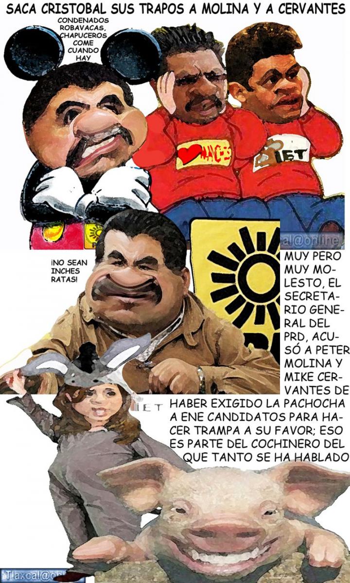 El secretario general del PRD, Cristóbal Luna Luna, tronó ayer contra el magistrado Pedro Molina y el consejero del IET, Mario Cervantes Hernández, a quienes ventaneó de chapuceros, cobrando entre 300 y 500 a varios candidatos para hacerlos ganar en la elección del siete de julio... esa acusación tiene que llegar a los tribunales con las pruebas necesarias, y de ser cierto estamos ante un verdadero escándalo de pronóstico reservado...