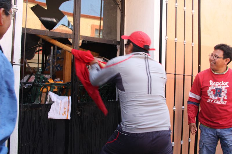 Los hechos ocurrieron por la mañana, cuando más de una centena de profesores pertenecientes a diversas organizaciones magisteriales, intentaron abrir con un serrucho el candado de la puerta de acceso principal, mientras que con el lanzamiento de ladrillos y palos rompieron algunas ventanas.