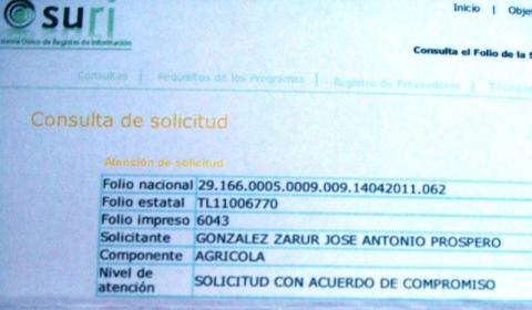 Con los números de folios; Nacional 29.166.0005.0009.14042011.62; Estatal TL 11006770; Impreso 6043, González Zarur José Antonio Prospero fue beneficiado con un programa social que operan los Gobiernos Estatal y Federal.