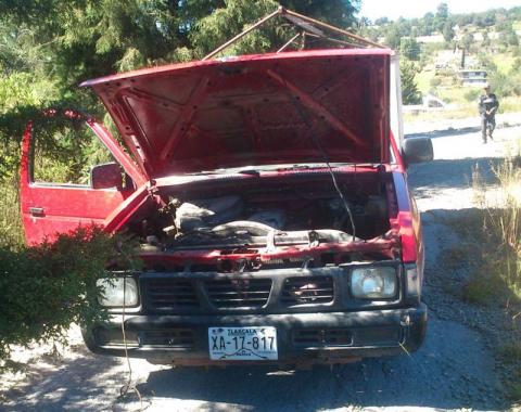 Al arribar al lugar se percataron que se trataba de una camioneta marca Nissan, color rojo, modelo 2003, con placas de circulación XA-17817 particulares del Estado de Tlaxcala, con número de serie 3N6CD15S63K106450.