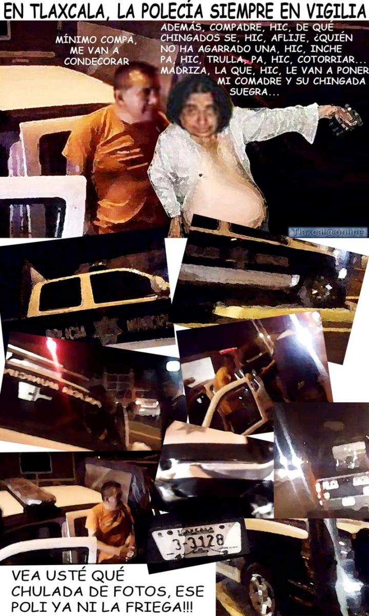 Ora sí, ni para hacerse el disimulado, vean ustedes al director de la policía municipal de San José Teacalco ... chocó la patrulla por andar bien chachalaco... no sabemos qué castigo le espera pero, ya me lo imagino, jurándole a sus superiores que no iba alegre... que nomás iba quitando obstáculos, no "juera a ser" que alguien se juera a trompezar con esos condenados postes, todos ahí de fierro, y bien duros (como la cabeza de este elemento)... ¿se imaginan qué cruda?, ¿Y qué cosa andaba haciendo hasta Santa Ana, como quien dice, fuera de jurisdicción y en estado etílico?