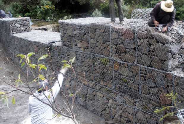 Las presas de gaviones son estructuras permanentes, flexibles y permeables de cuatro metros de altura por 20 de ancho, con un volumen de 210 metros cúbicos, construidas a base de prismas rectangulares de alambre galvanizado, y rellenas de piedras.