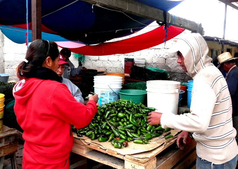 Claudia Basilio Cuevas, encargada de la maquiladora de chiles comenta que hay una nómina de al menos sesenta gentes, que fluctúa dependiendo de la mercancía que llegue.
