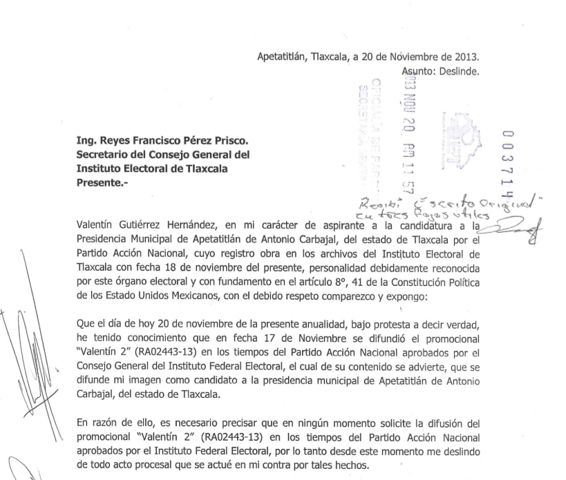De esta manera deslindó al partido y a su aspirante Valentín Gutiérrez, tomando como base que este acto es el primer momento en el que el Partido Acción Nacional tuvo como conocimiento sobre los actos emitidos por el Consejo Electoral de Instituto Electoral de Tlaxcala y de toda actividad procesal que se impute.