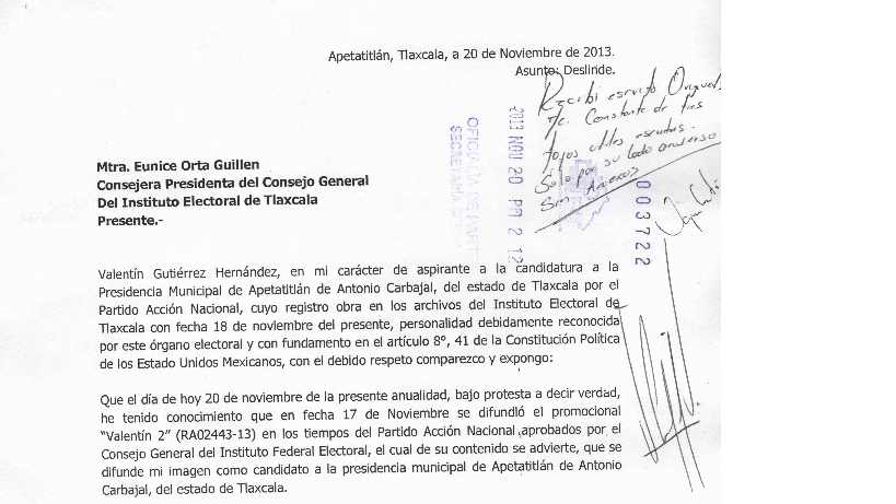 “Presento el deslinde en virtud de que corresponde a hechos realizados por terceras personas, advirtiéndose de un error respecto a los periodos de difusión aprobados por el Instinto Federal Electoral (IFE) con respecto al calendario del proceso electoral extraordinario del estado de Tlaxcala, errores que de ninguna manera son imputables a mi persona”.