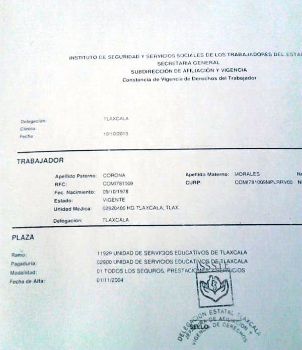 Al periódico e-consulta Tlaxcala le hicieron llegar un oficio de le delegación de ISSSTE en el que se asientan los datos de Ivonne Corona y en donde se aclara que está adscrita al ramo 11929 de la Unidad de Servicios Educativos de Tlaxcala y a la pagaduría 02900 de la misma dependencia.