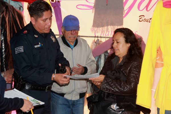 Uniformados de la SSPE recorrieron las principales calles del municipio capitalino repartiendo folletos y haciendo recomendaciones de viva voz sobre cómo prevenir delitos, así como incidentes, en los diversos negocios y tiendas del primer cuadro de la ciudad.