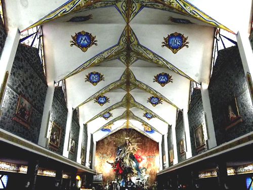 A la entrada nos recibe un amplio vitral de la Anunciación de María, atrás de esa cortina policroma descubrimos la gigantesca belleza de la Inmaculada aguardándonos con sus detalles y simbolismos.