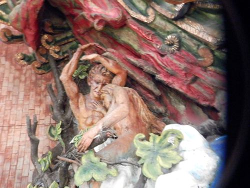 Aunque la idea original era que solamente estuvieran ellos dos, el artista decidió ponerle en un costado a Eva y Adán, y arriba de ellos la figura del Diablo sosteniendo en su mano la manzana, lo que simboliza el pecado original.