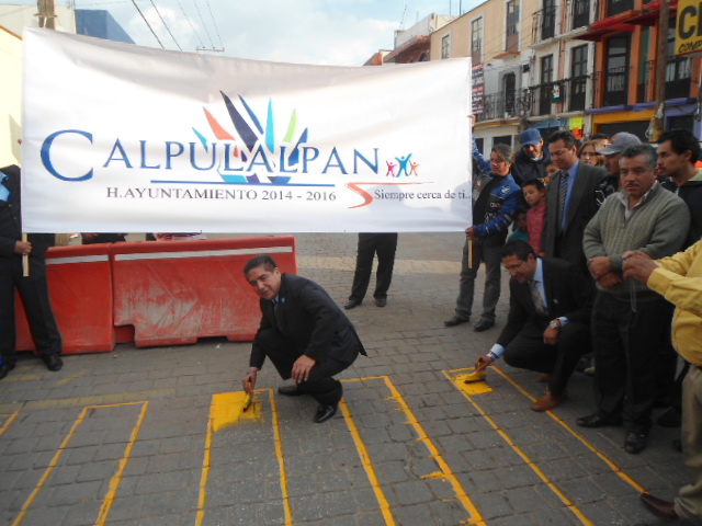 Al terminar la sesión solemne los miembros del nuevo Ayuntamiento de Calpulalpan dieron banderazo de inicio de obras de bacheo y balizacion e el primer cuadro de esta ciudad.