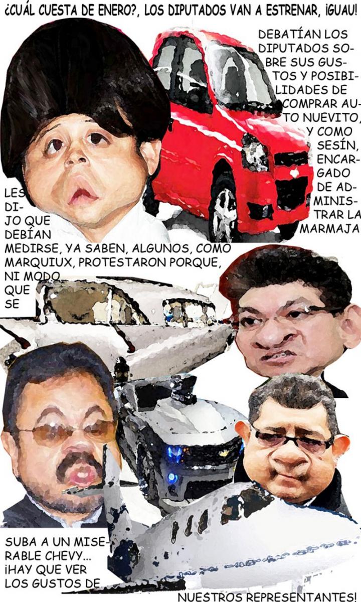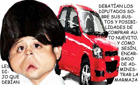 Los privilegios del poder... mientras buena parte de la raza tiene que empeñar la bici o el estéreo pa comprar de comer, nuestros representantes populares dedican buena parte de su tiempo a ponerse de acuerdo en el color, si debe tener uno o dos climas o si el auto nuevo para el que ya tienen la papeliza debe o no tener sonido de super lujo, digo pa'oir a la Yeni Rivera, o a su carnal, el Lupillo, ora que aiga modo de empezar con las fiestecitas, verdá?...