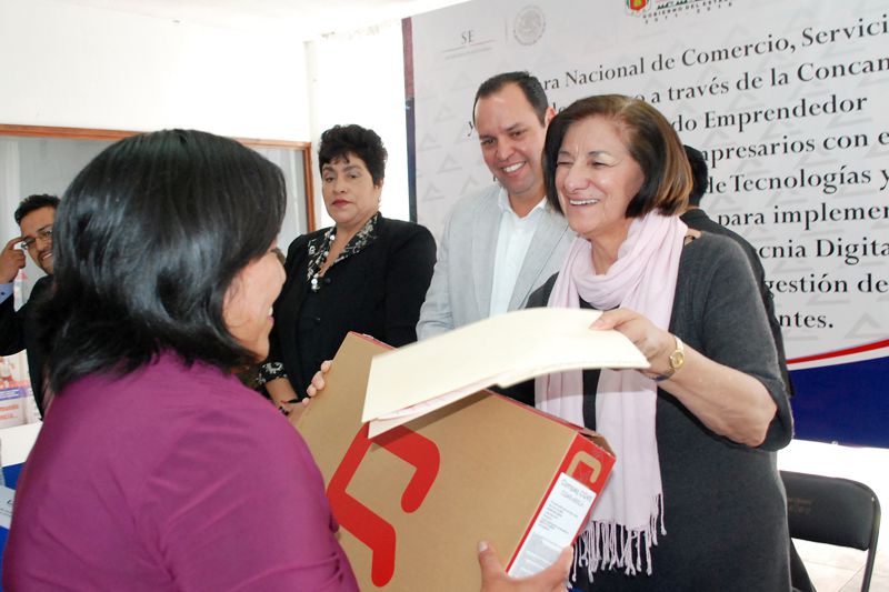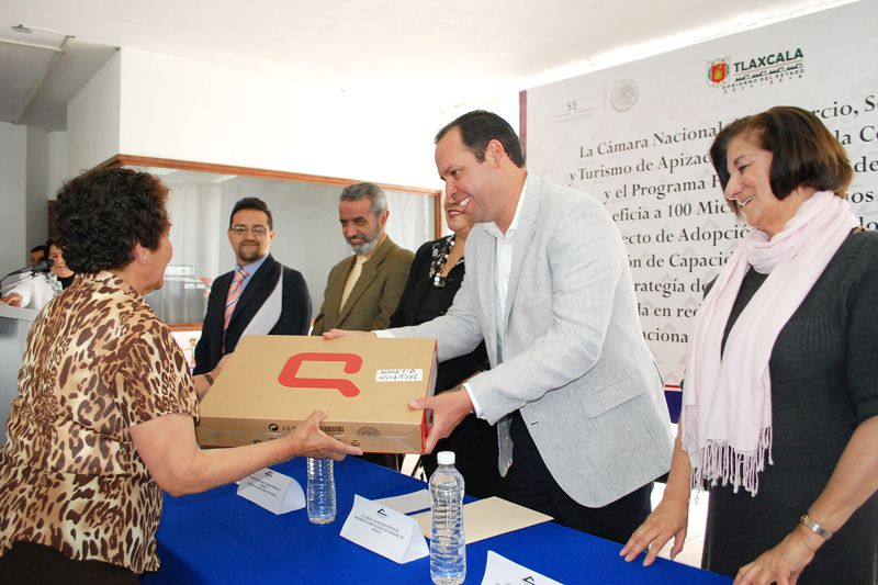 Durante el evento la presidenta de la Canaco de Apizaco, Yolanda Domínguez Vázquez, destacó el apoyo a 100 comerciantes de distintos rubros “los estamos apoyando para que puedan enfrentar las nuevas reglas fiscales, además de los equipos de computo, cada uno recibe la capacitación correspondiente”.