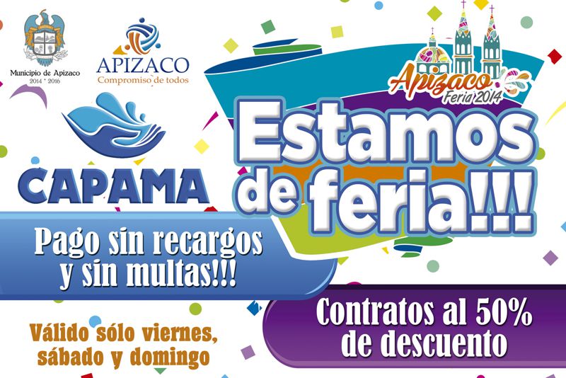 Al hablar al respecto el titular de la CAPAMA, Gerardo García Villalobos, dijo que todos los fines de semana que dure la Feria de Apizaco 2014, la CAPAMA instalará una caja móvil en el recinto ferial para que puedan acudir todos los ciudadanos que tengan pagos pendientes y así ponerse al corriente sin ningún recargo ni multa.