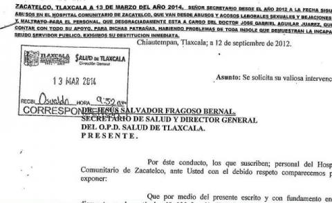 Trabajadores de la Secretaria de Salud (SESA) denunciaron que sufren terrorismo laboral por parte de directivos en el Hospital comunitario de Zacatelco, bajo la aparente protección del Secretario de Salud Jesús Fragoso Bernal quien se ha negado en ordenar una investigación y sancionar a los funcionarios del sector salud.