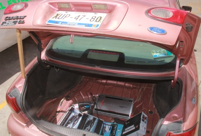 Al momento que realizaron la revisión al vehículo marca Ford tipo Coutour, color rosa con placas de circulación XUP-47-80 particulares del estado, localizaron en la parte de la cajuela objetos que el afectado reconoce como parte de su propiedad.