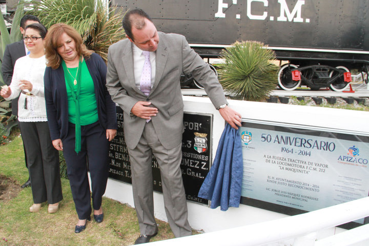 En seguida el presidente municipal de Apizaco, Jorge Luis Vázquez Rodríguez, acompañado por los integrantes del Cabildo, presidentes de comunidad y los diputados María Antonieta Stankiewicz Ramírez y Julio Cesar Hernández Mejía develó una placa alusiva a los 50 años “A la Fuerza Tractiva de Vapor de la Locomotora FCM 212”.