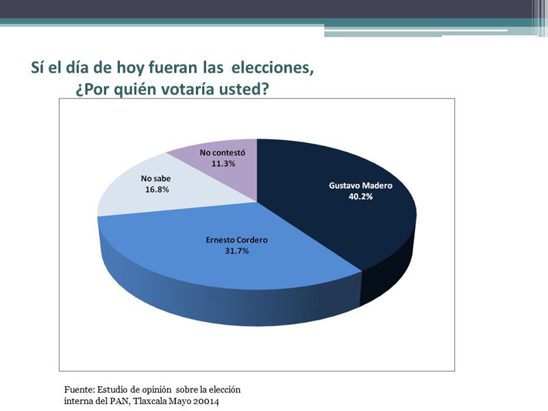 Aun cuando el porcentaje de posibles militantes que aseguran irán a votar el próximo 18 de mayo y que no saben a favor de quién lo harán, es mayor a la diferencia entre uno y otro candidato, al registrar un 16.8 por ciento, dicho estudio demoscópico se suma a la tendencia de resultados publicados en el transcurso de estas últimas semanas por reconocidas casas encuestadoras y medios impresos de circulación nacional, como El Universal y Reforma que ponen arriba a la fórmula de Gustavo Madero y Ricardo Anaya al otorgarles entre 10 y 11 puntos de ventaja sobre Ernesto Cordero y Juan Manuel Oliva.