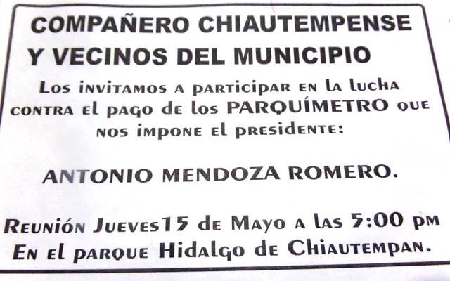 Tras una convocatoria realizada a través de las redes sociales en la que se invitaba a la ciudadanía Chiautempense a sumarse en contra de la instalación de parquímetros y de la mejora de la imagen urbana, se tuvo como resultado una pésima respuesta.