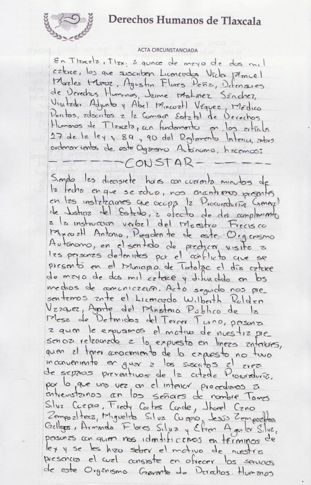 Luego del problema que se suscitó en el municipio de Totolac por la detención de 12 personas por el presunto uso de pirotecnia, tras haber sido liberados y haber emitido declaraciones a los medios de comunicación en relación a que habrían violentado sus derechos humanos y la complicidad que aseguraron tiene la CEDH, autoridades de este organismo presentaron pruebas en las que algunos de los indiciados negarían haber sido maltratados.