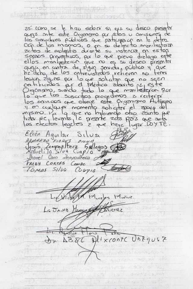 Esta documentación contrasta con las versiones emitidas por los detenidos y por los mismos pobladores que habrían observado los hechos el pasado 14 de mayo, no obstante, la rúbrica de algunos de los presuntos culpables manifiesta su total conformidad con los hechos acontecidos y no buscar alguna otra alternativa jurídica al respecto.