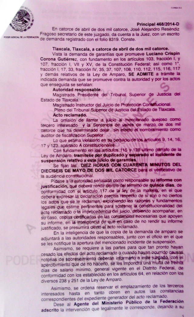 El documento refiere que fue aceptado debido a la omisión de llamar al juicio a Corona Gutiérrez como tercero interesado tal y como lo señalan los artículos 9, 14, 16, 17 y 123 Constitucional, por lo que el Poder Judicial de la Federación dejaría sin efecto la sentencia del 20 de marzo de 2014, en la que sería depuesto como titular del Órgano de Fiscalización Superior (OFS).