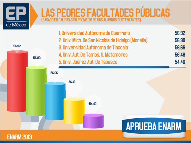 Las peores evaluadas son lideradas por la Escuela Libre de Homeopatía de México con 52.33 puntos, seguida del Instituto de Ciencias y Estudios Superiores de Tamaulipas que registró 53.29 puntos y la tercera posición es para el Instituto de Estudios Superiores de Tepeaca que obtuvo 53.93 puntos.