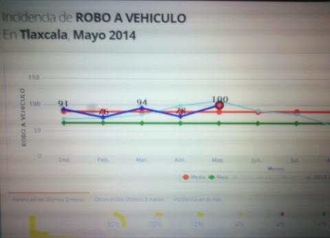 Conforme a un estudio realizado por “El Semáforo Delictivo”, el robo a vehículos automotores en Tlaxcala han incrementado con respecto al mismo periodo del año pasado que corresponde a los meses de enero, febrero, marzo, abril y mayo, siendo que en 2013 en estos cinco ejercicios se contabilizaron 435, en tanto que para 2014 va un total de 439.