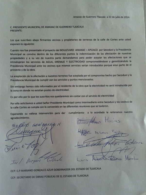 En un oficio que enviaron al edil de extracción perredista, pero que también va con copia para el gobernador, Mariano González Zarur, los propietarios recordaron que cuando se presentó el proyecto carretero, éstos aceptaron una indemnización económica por la afectación en sus propiedades, pero también se convino la introducción del drenaje, agua potable y electricidad “comprometiéndose y garantizándolo la Presidencia Municipal ante los vecinos (...). La aceptación de la afectación a nuestros terrenos fue aceptada con el compromiso hecho por Secoduvi y la alcaldía de cumplir con los servicios mencionados”.