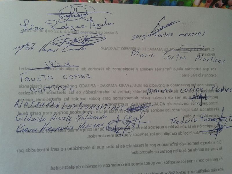 Entre los firmantes se encuentran Sergio González, Paloma Pozos, José Valente Palafox, Luis Alberto Ramos, Joel Vázquez, Maricela de León, Lina Rodríguez, Sergio Cortés, Mario Cortés, Fausto Cortés, Teódulo Pozos, Gildardo Huerta, Raquel Hernández, Marina Cortés, entre otros.