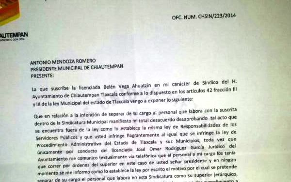 Por instrucciones del alcalde de Chiautempan, Antonio Mendoza Romero, le fue suspendido arbitrariamente todo el personal que labora con la síndico municipal Belén Vega Ahuactzi, sin embargo, la representante legal justificó que el edil se excedió de sus funciones de acuerdo a lo que marca la Ley, por lo que no aceptó tal ordenamiento.