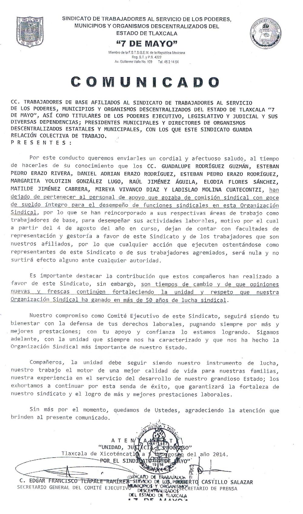 A partir del 4 de agosto, de acuerdo al comunicado emitido por el Comité Ejecutivo del sindicato “7 de mayo”, los trabajadores mencionados se han reincorporado a sus respectivas áreas de trabajo, como trabajadores de base, para desempeñar sus actividades laborales, por lo tanto a partir de la fecha señalada, dejan de contar con facultades de representación y gestoría a favor del sindicato y de los trabajadores afiliados.