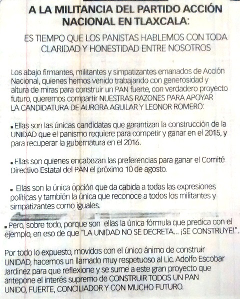 De acuerdo al desplegado a una plana que los munícipes realizaron junto con tres diputados locales, sostuvieron sin presentar el soporte de sus declaraciones, que; “ellas encabezan las preferencias para ganar el Comité Directivo Estatal del PAN el próximo 10 de agosto”, a pesar de que las últimas encuestas las ubicaron en la tercera posición.