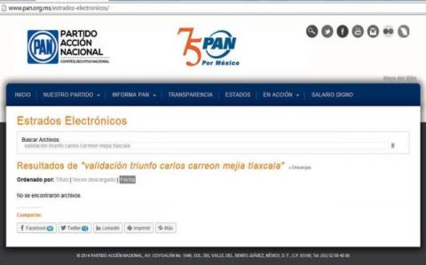 En el monitoreo que este reportero realizó al sitio electrónico del PAN a nivel nacional al corte de las 18:00 horas de este viernes, se pudo corroborar en el apartado donde están los estrados, que no hubo ninguna resolución o aviso para Tlaxcala, ni mucho menos para confirmar el triunfo de Carlos Carreón Mejía.