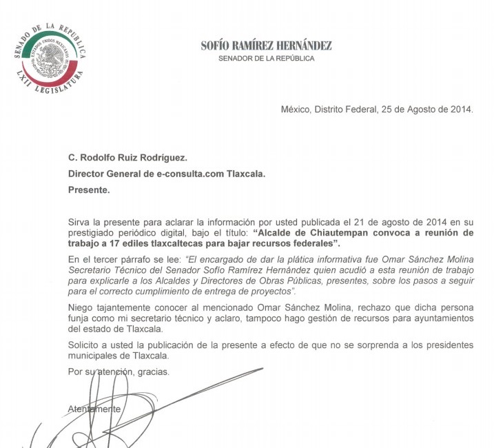 El senador al tener conocimiento de que existen personajes que utilizan su nombre para posiblemente lucrar con los Ayuntamientos, mandó a la dirección de este portal una carta aclaratoria en la que niega de manera tajante conocer a Omar Sánchez Molina y mucho menos ser su secretario técnico, al mismo tiempo que aseguró que no realiza algún tipo de gestión para Ayuntamientos de Tlaxcala.