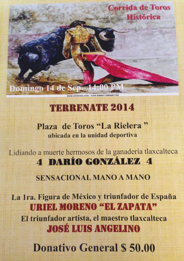 Dentro de las actividades que se realizarán con motivo de la feria de Terrenate, se presentarán el próximo domingo 14 de septiembre “el Zapata” y José Luis Angelino en un mano a mano en la plaza de toros “La Rielera” ubicada en la unidad deportiva de este municipio con un donativo general que será de 50 pesos.