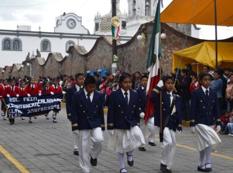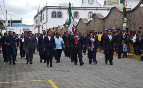 El alcalde Polvo Rea portaba la bandera nacional y encabezada el contingente conformado por más de 15 instituciones de nivel básico así como medio superior que se encuentran en Tlaltelulco, acción que aplaudieron los asistentes.